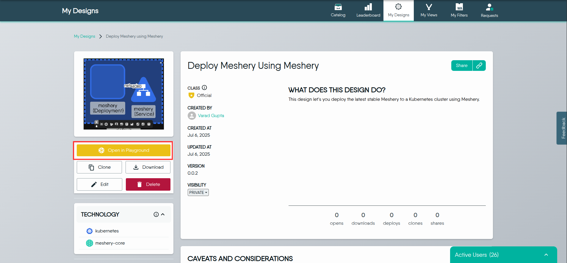 Log in to Meshery Playground. After successfully logging in, you'll land on the dashboard.